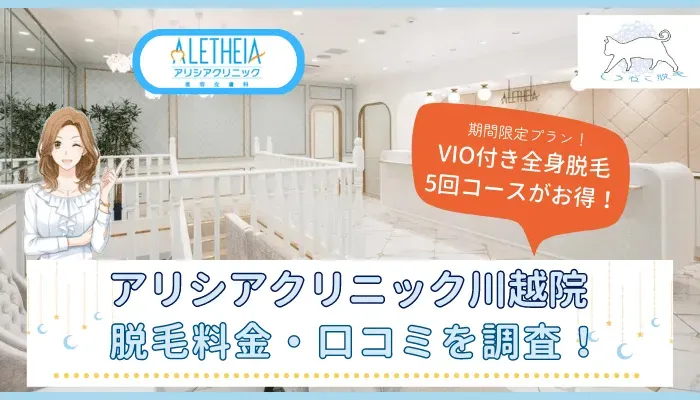 総評からお伝えすると、アリシアクリニック川越院は全身脱毛をお得に受けられるおすすめの医療脱毛クリニックです。
