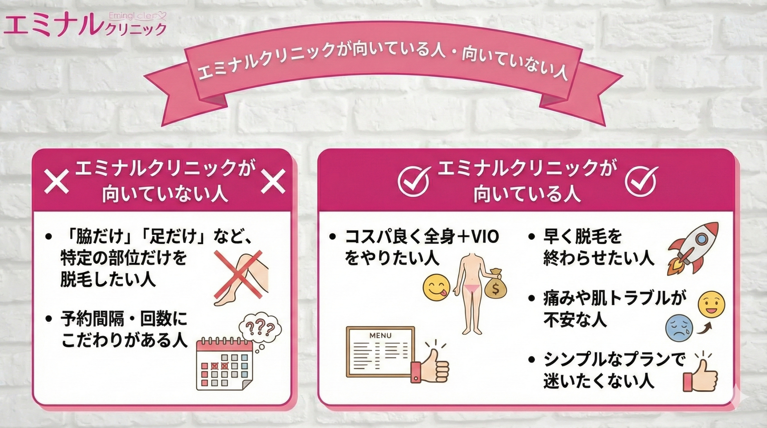 エミナルクリニックは、全身脱毛を専門に行っており、各コースをリーズナブルな価格で受けられるおすすめの医療脱毛クリニックです。