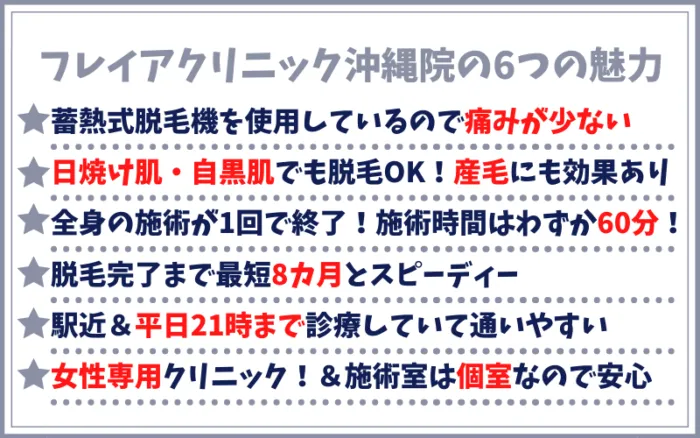 上記からもお分かりになるように、『フレイアクリニック沖縄院』は月々[affi id=8763]で全身脱毛が始められるほか、施術時間が60分と短く、脱毛完了までがわずか8カ月など、多くの魅力があるクリニックです。