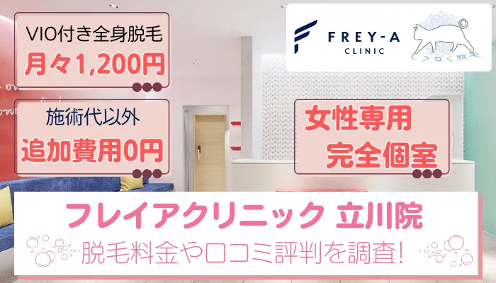 フレイアクリニック立川院の総評をお伝えすると、全身・VIO・顔など各部位の料金が安く、施術代を除く追加費用0円で通えるおすすめの医療脱毛クリニックです。