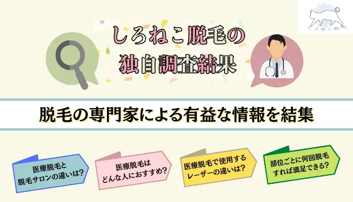 しろねこ脱毛では、日本全国で医療脱毛施術を行っているクリニック・皮膚科様のご協力により、独自の調査(5つのアンケート)を常に行っています。