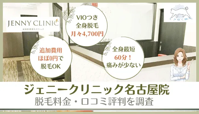 結論、ジェニークリニック名古屋院は、VIO付きの全身脱毛5回が月々4,700円&追加費用ほぼ0円で始められる料金が安いおすすめの医療脱毛クリニックです。