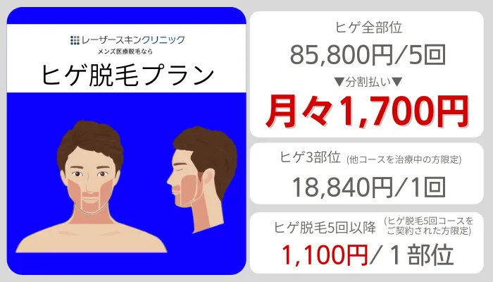 ヒゲ全部位脱毛5回コース総額85,800円分割払いだと月々1,700円で始められる。