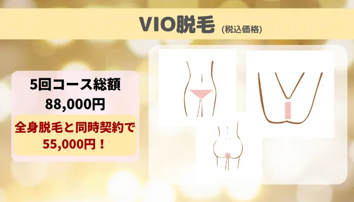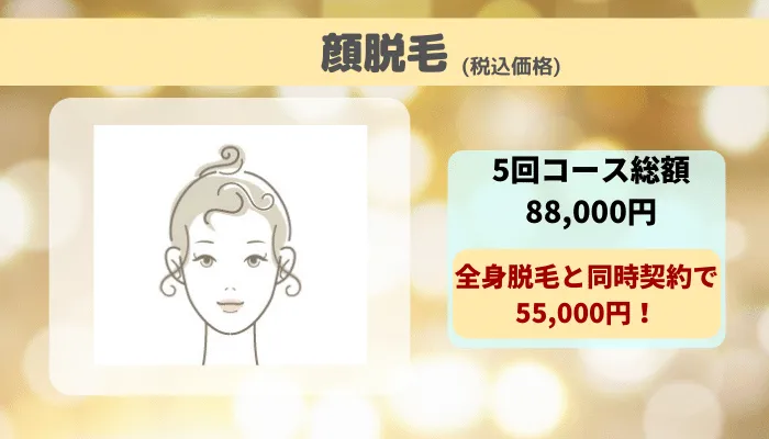 また、顔やVIOを同時契約する場合、全身脱毛5回コースの料金が[affi id=195]まで安くなるため、広範囲をお得に脱毛したい方はよりリーズナブルな価格で脱毛できます。(平日に通える方限定の価格)