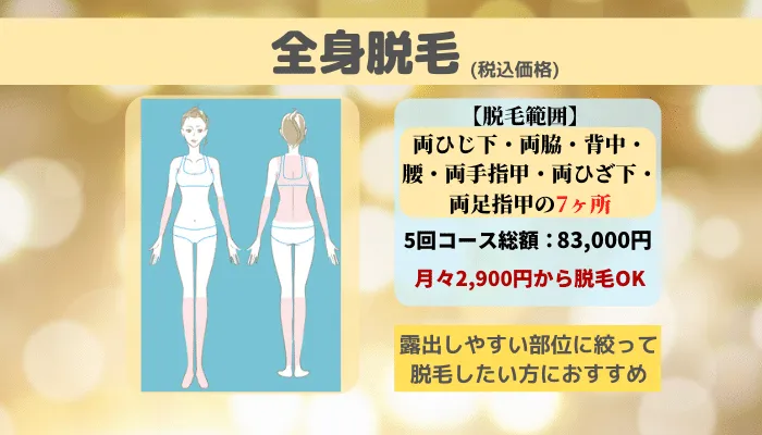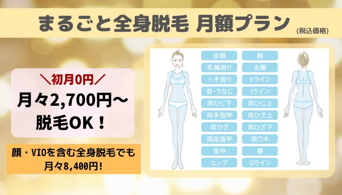 顔とVIOを除く全身脱毛は月々[affi id=165]から受けられ、初月0円でスタートできます。