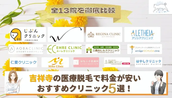 吉祥寺周辺にある医療脱毛クリニック全13院から、脱毛料金が安く脱毛完了まで快適に通えるクリニック5院をご紹介しました。