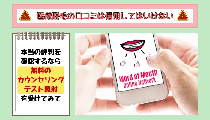 仮に、本当に施術を受けた人の口コミがあったとしても、何回で満足できたのか、痛みの有無などは参考にならないので、口コミは参考にせずあなたの肌で確かめてみてください。