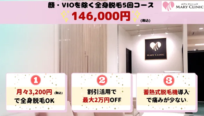 - 全身脱毛(顔・首、VIOなし):[affi id=1456]/5回