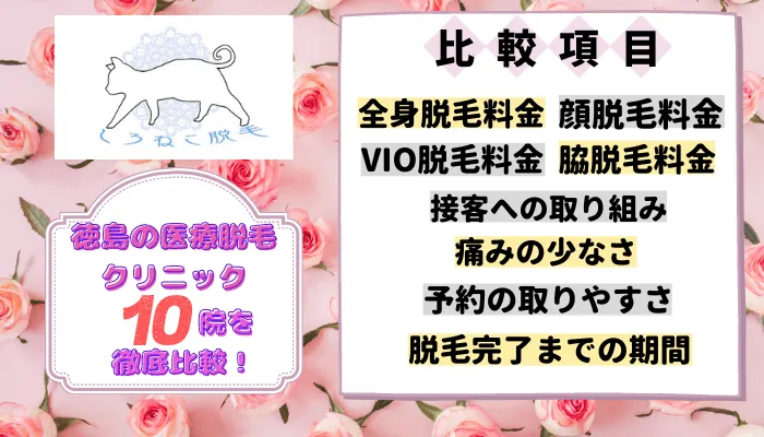 本記事では、徳島で料金が明確な医療脱毛クリニック全10院全身脱毛・VIO脱毛・顔脱毛・脇脱毛の料金や痛みの少なさ、予約の取りやすさなどの特徴を徹底的にリサーチしました。