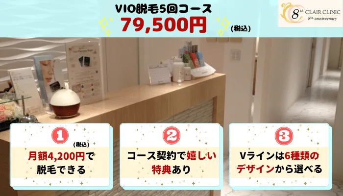VIO脱毛5回コースの総額は89,500円と安く、月額4,200円で通うこともできます。