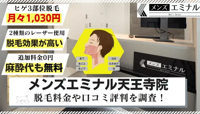 本記事では、天王寺駅から徒歩2分の位置にあるエミナルクリニックメンズ天王寺院の各部位の料金や追加料金、支払い方法や解約について、使用しているレーザーの種類、学割や紹介割の詳細など契約前にチェックしておきたい情報を調査した。