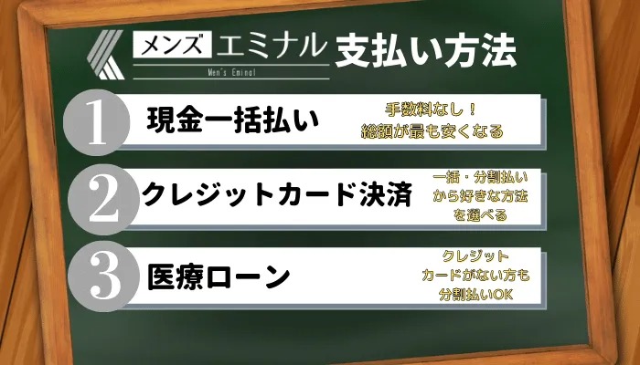 | 支払い方法 | ・現金 ・クレジットカード(VISA、Master、JCB、AMEX) ・医療ローン ・自社クレジット |