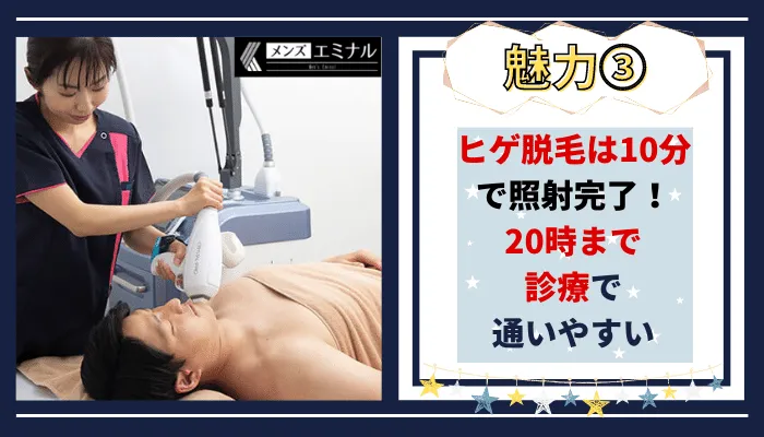 おすすめ理由3:ヒゲ脱毛は10分で照射完了!20時まで診療で通いやすい