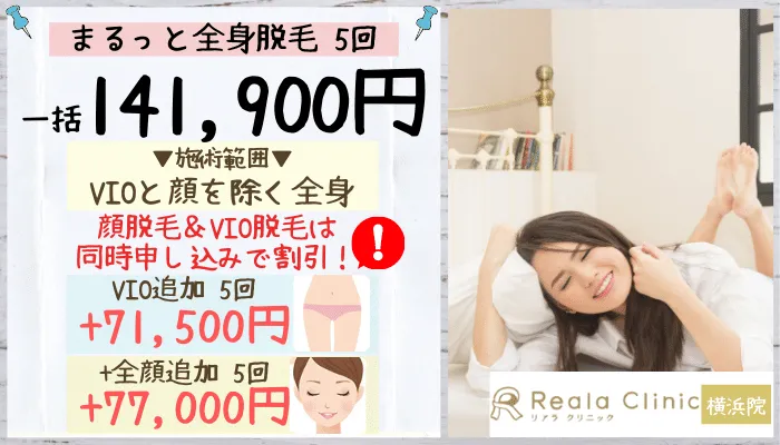 リアラクリニック横浜院には数多くの脱毛プランが用意されており、全身脱毛でも月々[affi id=616]で医療脱毛が受けられます。