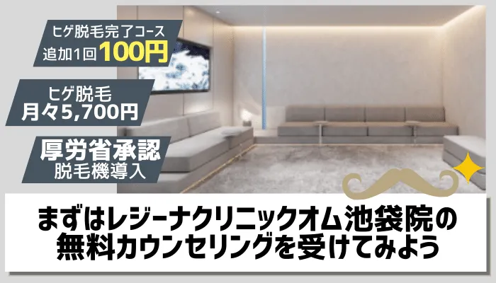 レジーナクリニックオム池袋院は、ヒゲ脱毛のコース終了後1回100円で追加できる保証プランがあり、麻酔が完全無料、剃り残し剃毛代も無料など魅力の多いクリニックだ。