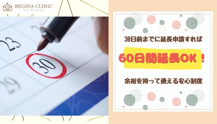 レジーナクリニックでコース契約した場合、有効期限内に契約した回数分を通い切る必要がありますが、30日前までに申請すれば60日間延長可能な制度があります。