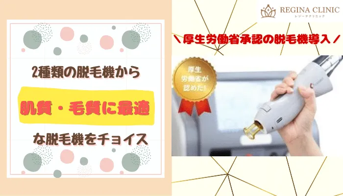 『レジーナクリニック柏院』では、厚生労働省承認の脱毛機を導入しており、計2種類の脱毛機から一人ひとりの肌質・毛質に合わせて施術を行ってくれます。