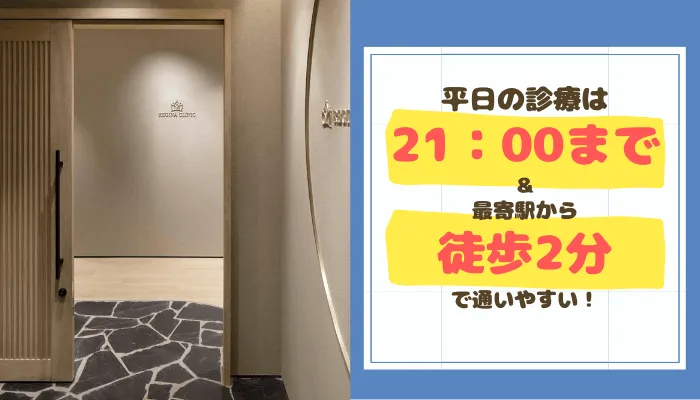 忙しくて中々通えるクリニックが見つからなかったという方も、21時まで診療、最寄駅から徒歩2分なら通いやすいですよね。