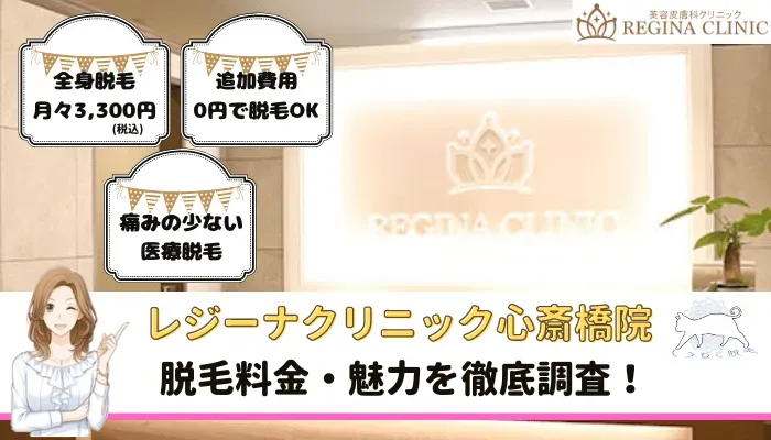 『レジーナクリニック心斎橋院』は、顔・VIOを除く全身脱毛を月々3,300円から受けられる脱毛料金が安い医療脱毛クリニックです。