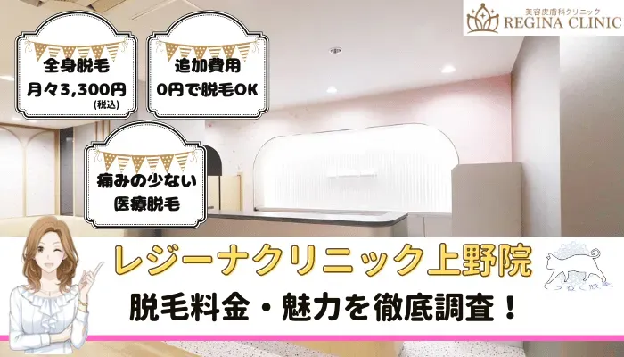 今回、ihada(いはだ)編集部が『レジーナクリニック上野院』を調査した結果、月々3,300円から全身脱毛を受けられて、追加費用がかからない優良クリニックであることが分かりました。