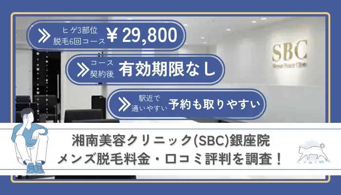 当記事では、銀座一丁目駅3番口からすぐ通える湘南美容クリニック(SBC)銀座院のメンズ脱毛に関する情報を徹底的にリサーチしたため、最後まで読めば以下の情報を全て知ることができる。