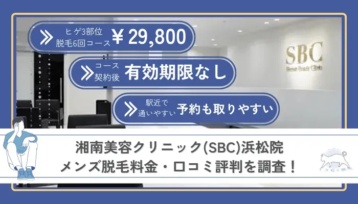 当記事では、JR浜松駅から徒歩1分で通える湘南美容クリニック(SBC)浜松院のメンズ脱毛に関する情報を徹底的にリサーチしたため、最後まで読めば以下の情報を全て知ることができる。