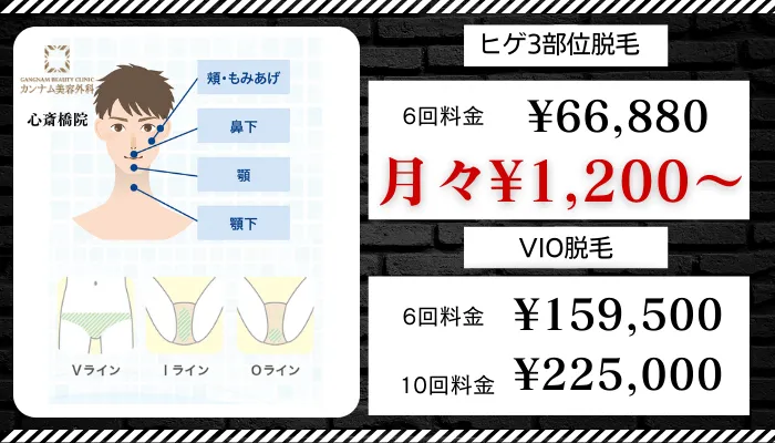メンズダビデ大阪心斎橋のヒゲ、全身、VIO、腕脱毛料金・オプション料金
