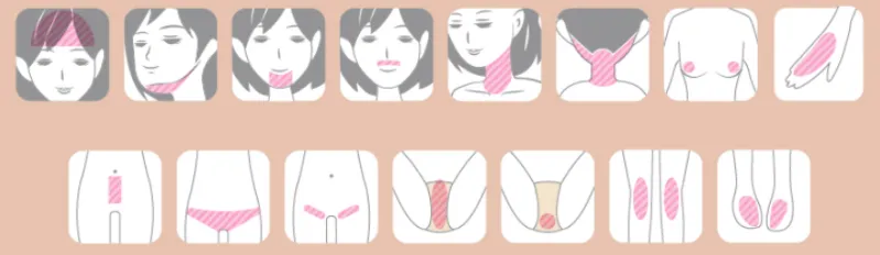 頬・もみあげ、鼻下、顎、顎下、Vライン、Iライン、Oライン、胸、上腕、腹、背中、ワキ、お尻、ひじ下、手背・手指、太もも、膝下(ひざ・すね・ふくらはぎ)、足背・足指