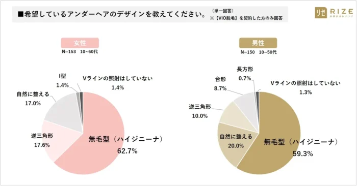 リゼクリニックの調査では、男女ともに6割「無毛型(ハイジニーナ)」を希望(女性62.7%・男性59.3%)しており、デザインの中で1番人気となりました。
