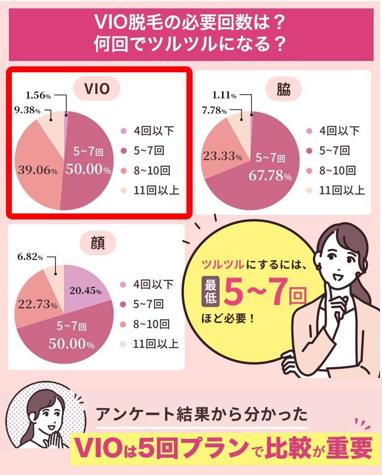 VIO脱毛経験者の女性100人にアンケートを取ったところ、約半数の女性が5~7回のVIO脱毛を経てツルツルになったという回答でした。