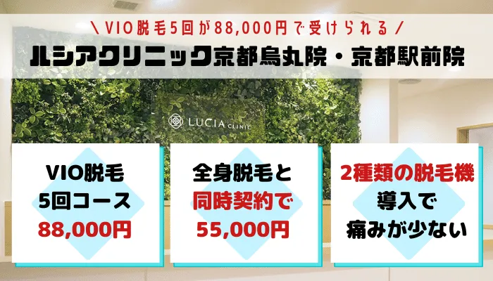 ルシアクリニック京都烏丸院についてもっと詳しい脱毛料金や魅力が知りたい方は、『ルシアクリニック京都烏丸院の脱毛料金や口コミ評判を徹底調査』した記事をご覧ください。