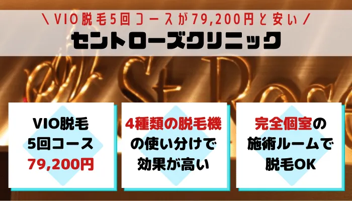 『セントローズクリニック』は、VIO脱毛5回コースの総額が79,200円と相場に比べて安いです。