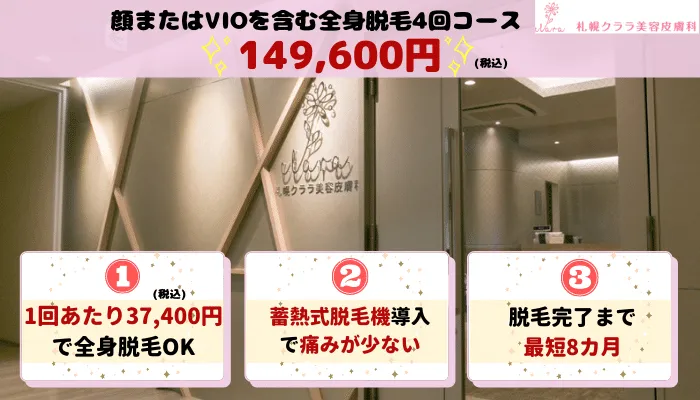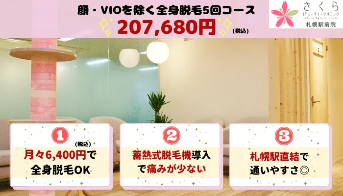 - 全身脱毛(顔・VIO除く):『エミナルクリニック』『レジーナクリニック』『札幌さくらビューティークリニック』『札幌あおばクリニック』