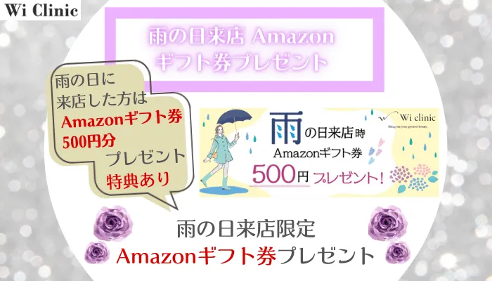 雨の日にクリニックに来店した方を対象に、Amazonギフト券500円のプレゼントを行っています。