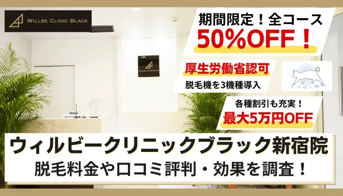 ウィルビークリニックブラック新宿院は、期間限定全メニュー50%OFFの破格なキャンペーンを実施しているため、医療脱毛を始めるなら年齢が若い今が最もおすすめである。